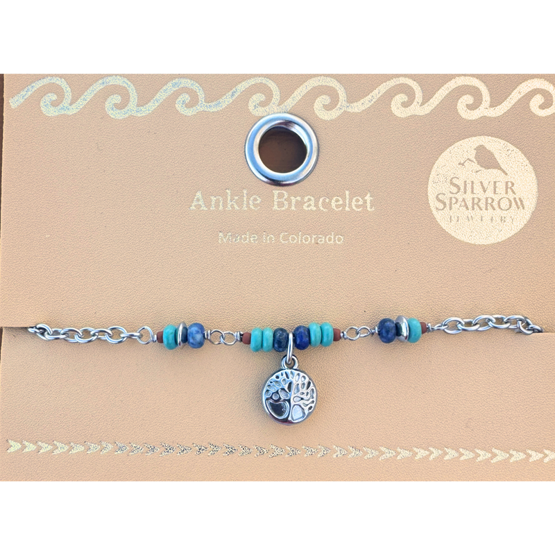 Tree charm ankle bracelet with turquoise and lapis
