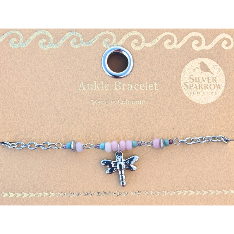 Dragonfly ankle bracelet with pink opal