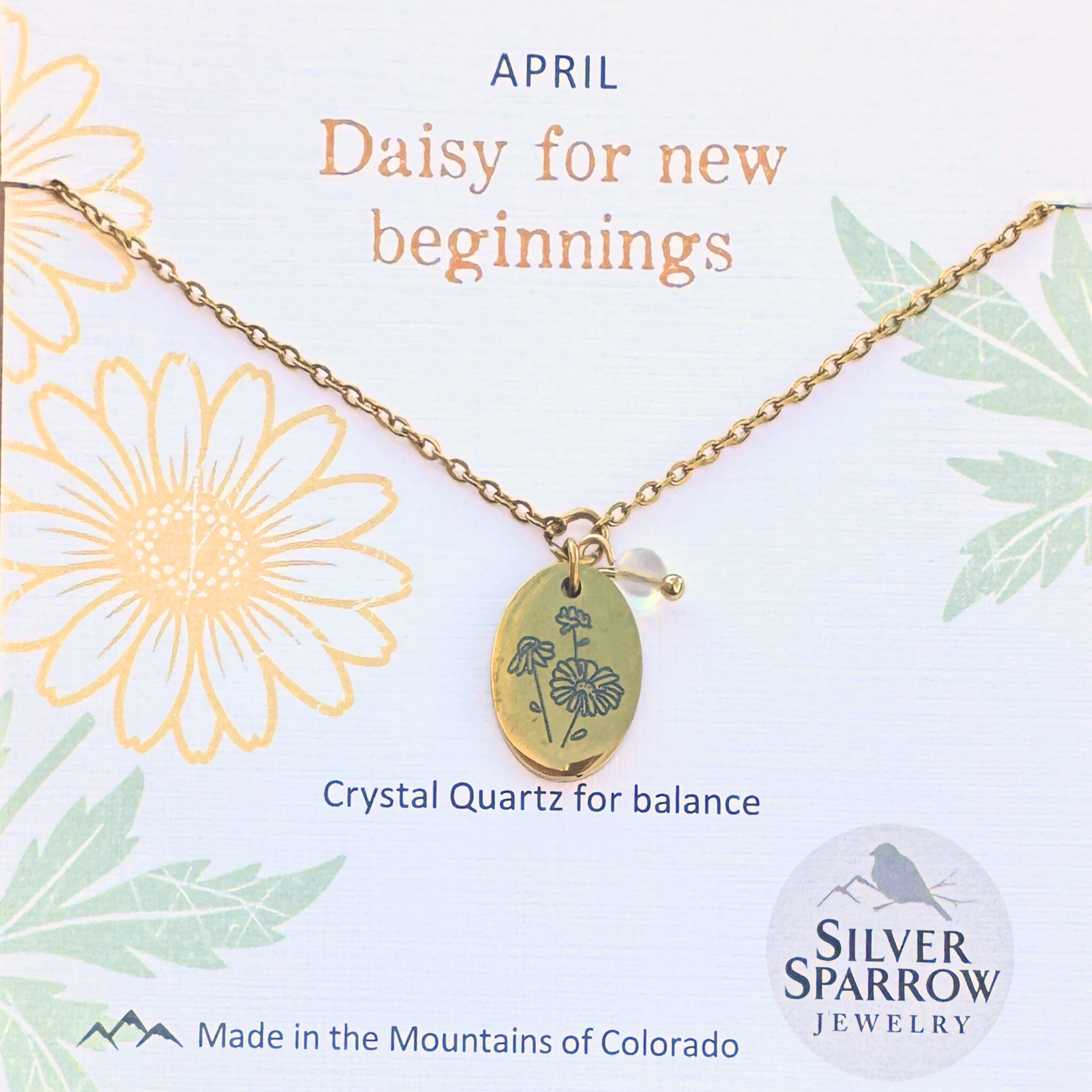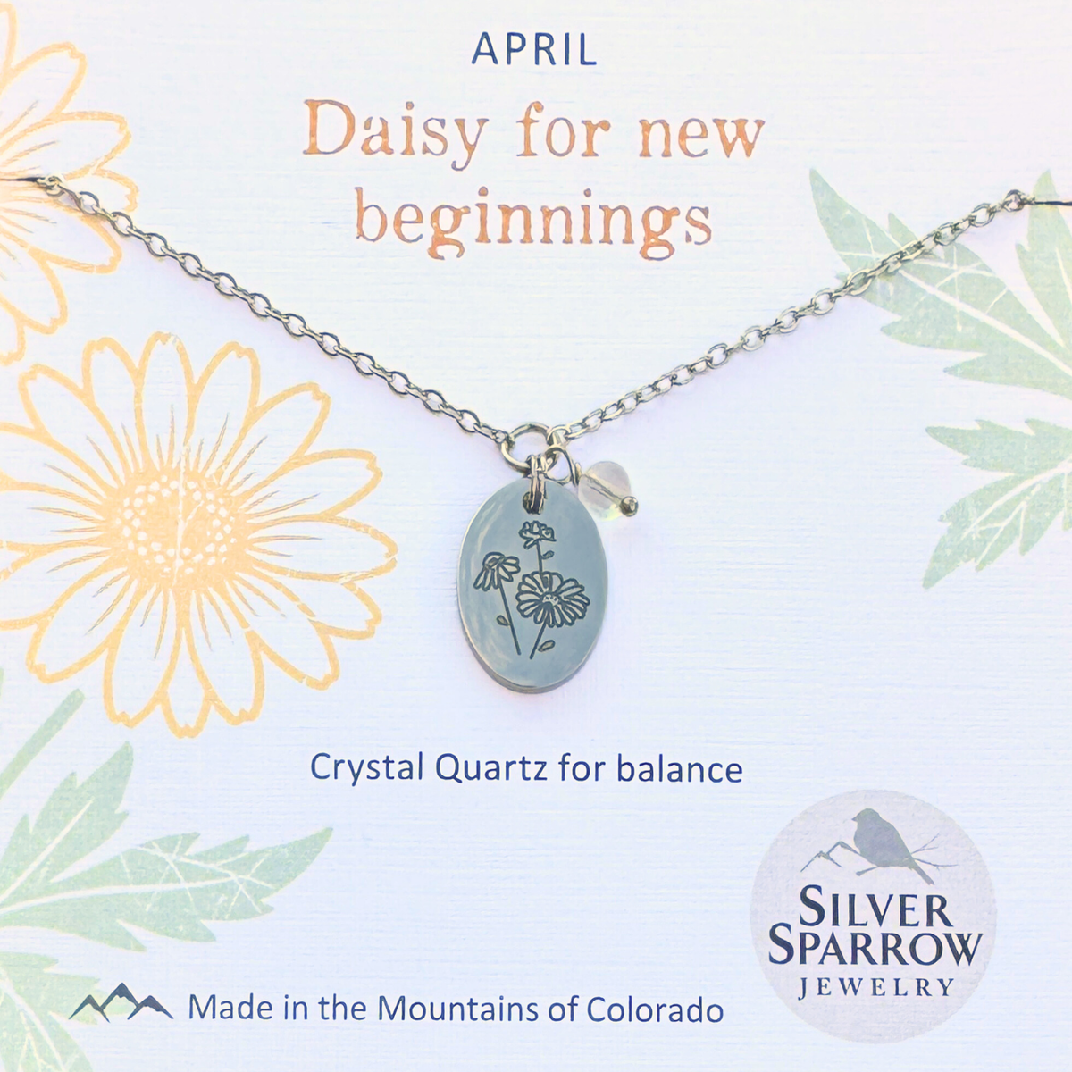 A daisy charm - the birth flower for April - is paired with crystal quartz for a simple yet elegant design.  The charm, chain, and all metal components are made with waterproof stainless steel.