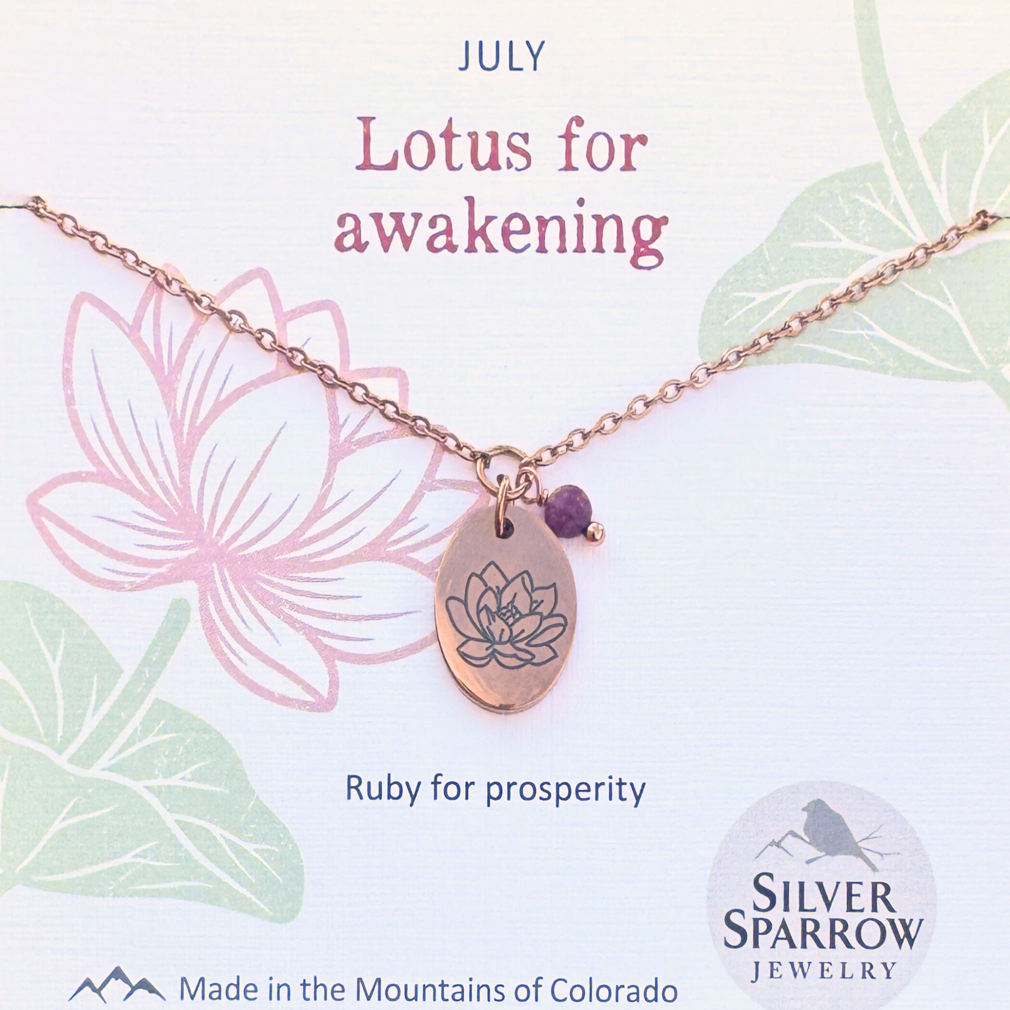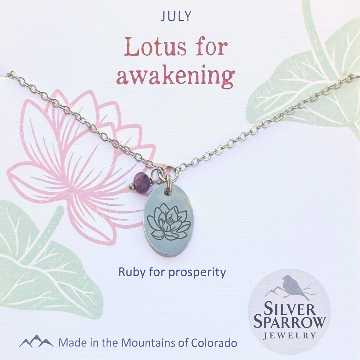 A lotus charm - the birth flower for July - is paired with ruby for a simple yet elegant design.  The charm, chain, and all metal components are made with waterproof stainless steel.