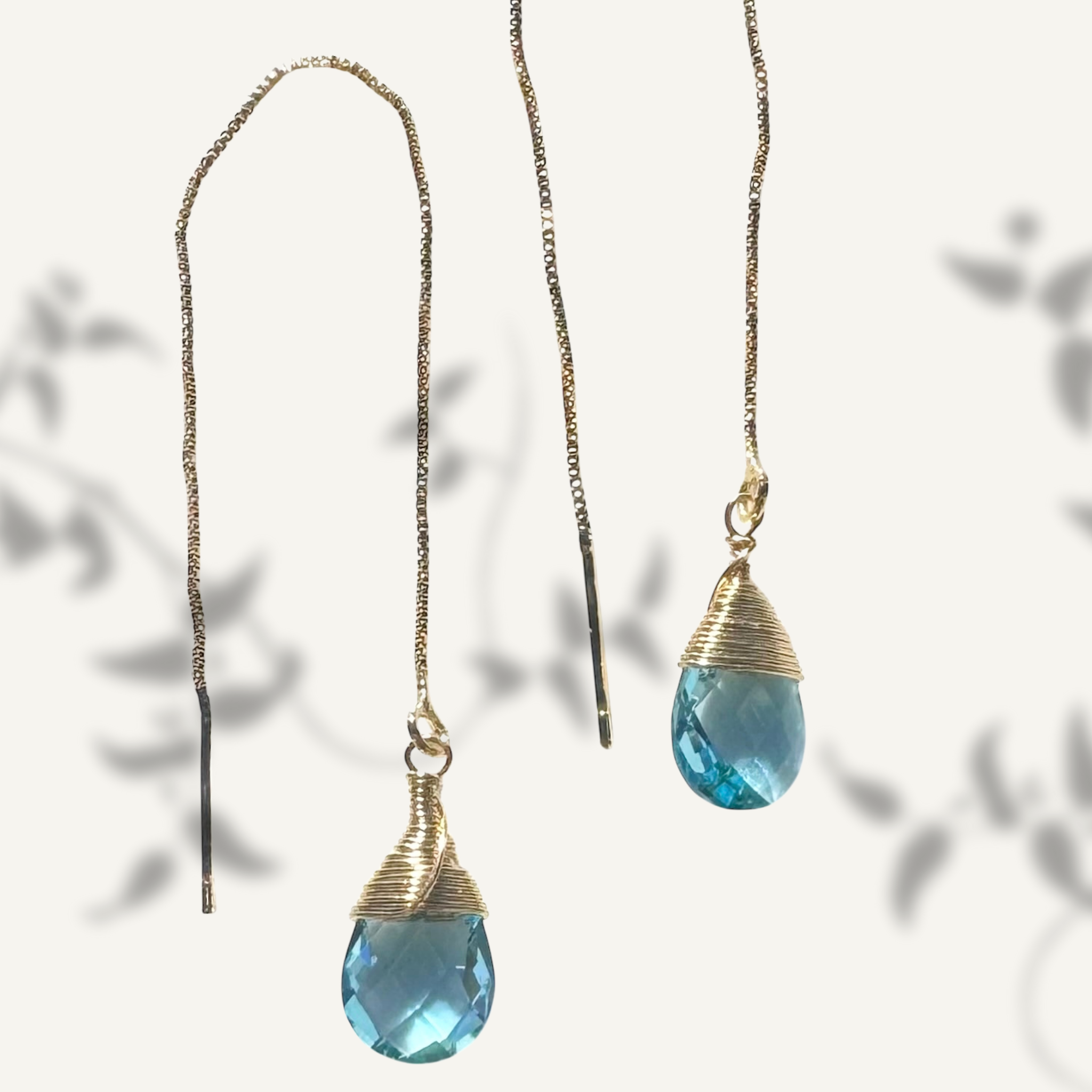 Blue topaz drop earrings on golden threaders. Known for promoting clarity and calm, these gemstones add understated elegance to any look. The delicate design moves gracefully with you throughout the day.
