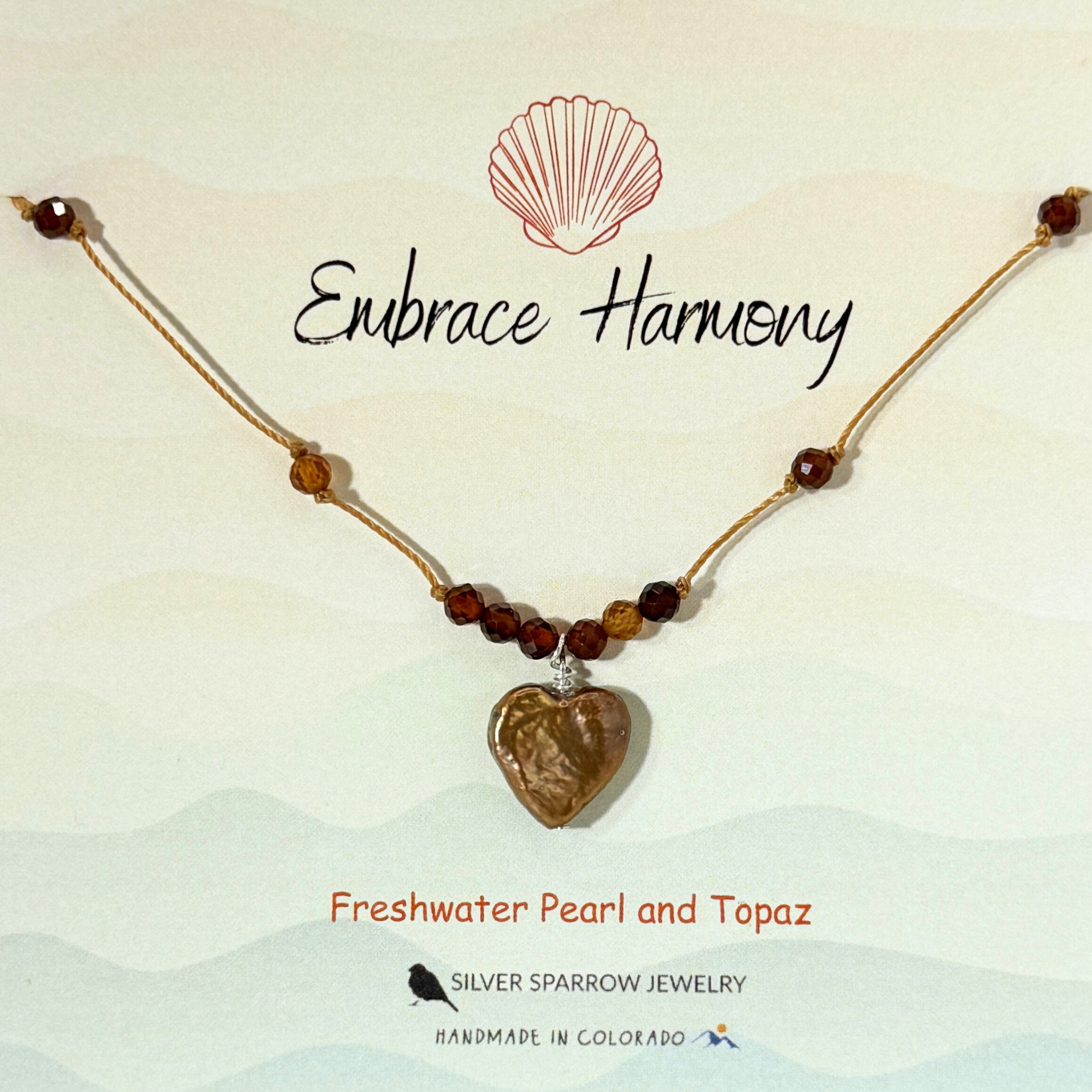 This simple yet elegant necklace features a stunning, hand-picked 10mm bronze heart-shaped pearl flanked by charming faceted topaz beads.  The necklace is hand-knotted on delicate but durable cord, perfect for adding the magic of the water to your everyday style!