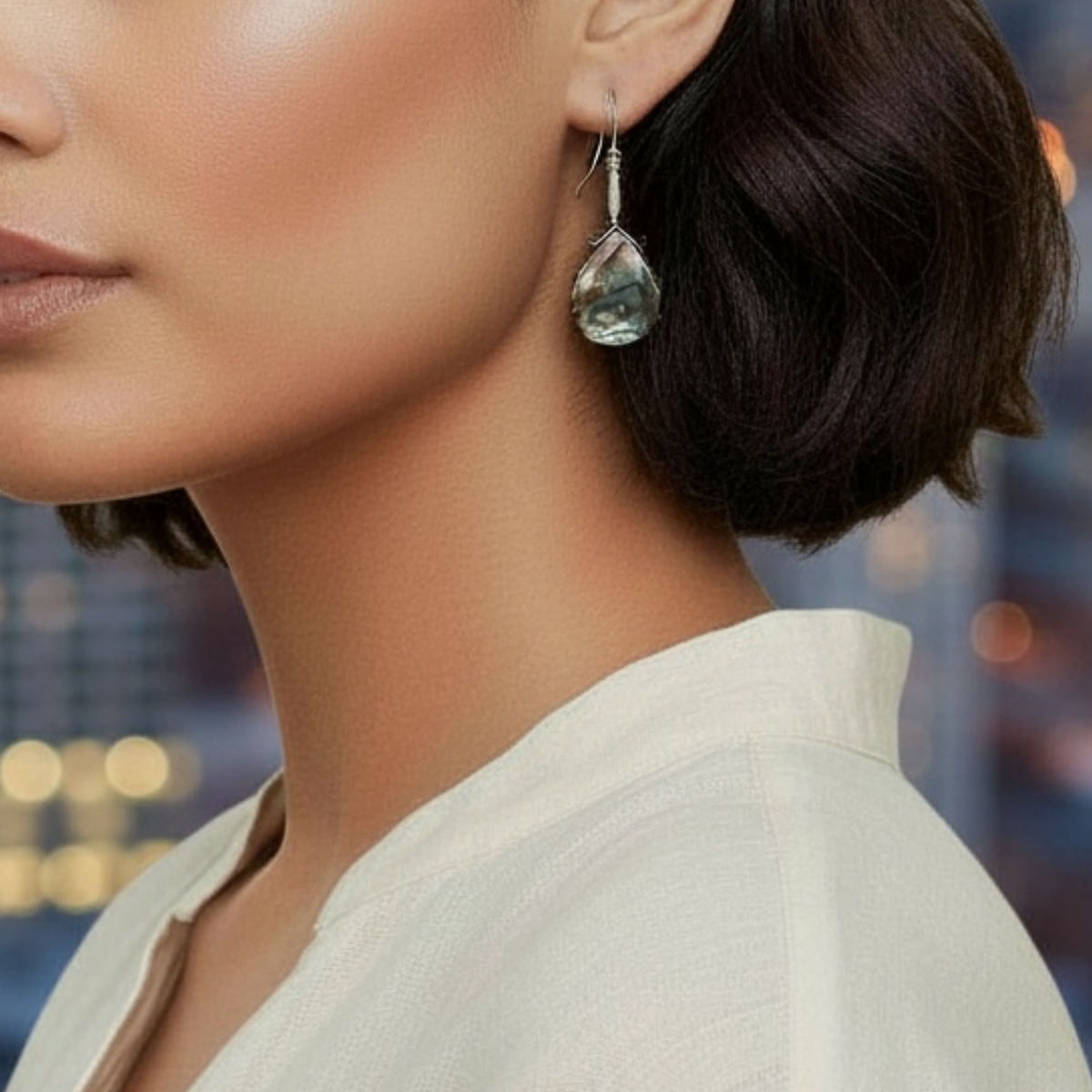 These Hill Tribe Silver Abalone Drop Earrings celebrate the beauty of handcrafted design and natural materials. Featuring shimmering abalone shell with its signature iridescent hues, each drop reflects flashes of blue, green, and violet that catch the light beautifully. The shell is paired with richly textured Hill Tribe silver, known for its high silver content and traditional craftsmanship.