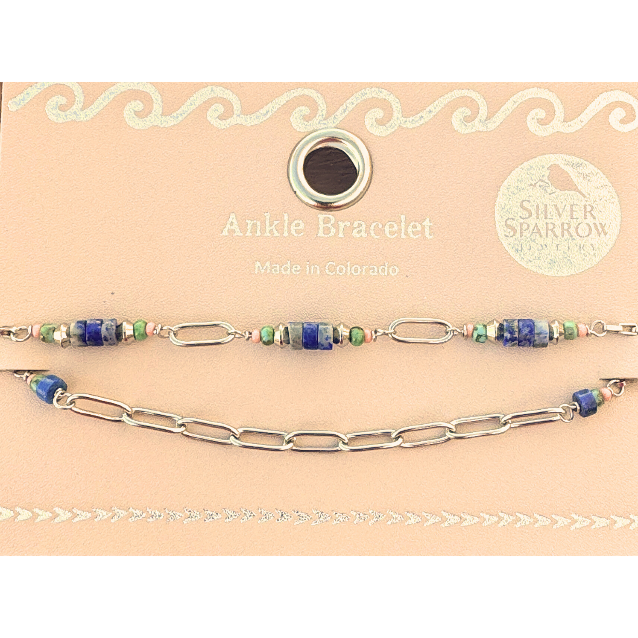 This handcrafted ankle bracelet features sodalite with cable and paperclip chain. The chain and all metal components are made from waterproof stainless steel.