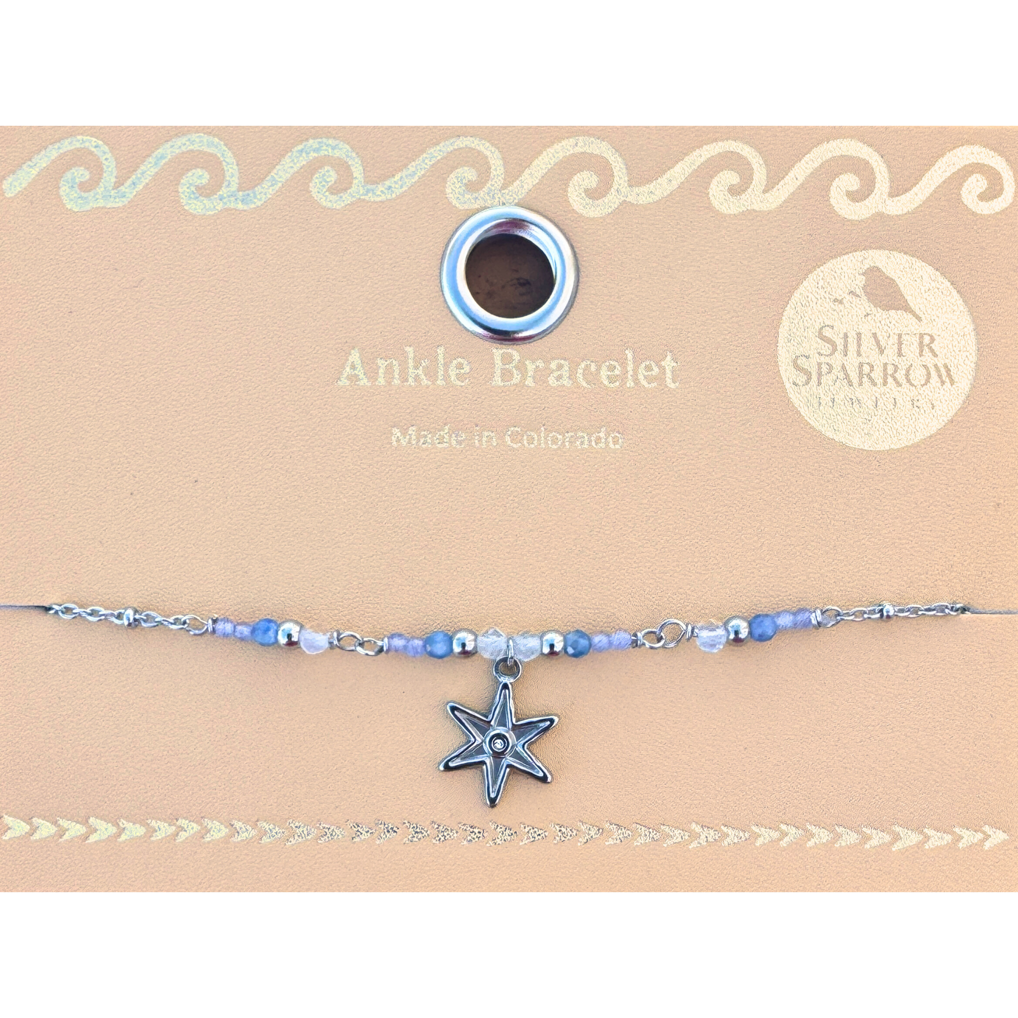 This handcrafted ankle bracelet features a star charm with aquamarine and kyanite. The charm, chain, and all metal components are made from waterproof stainless steel.