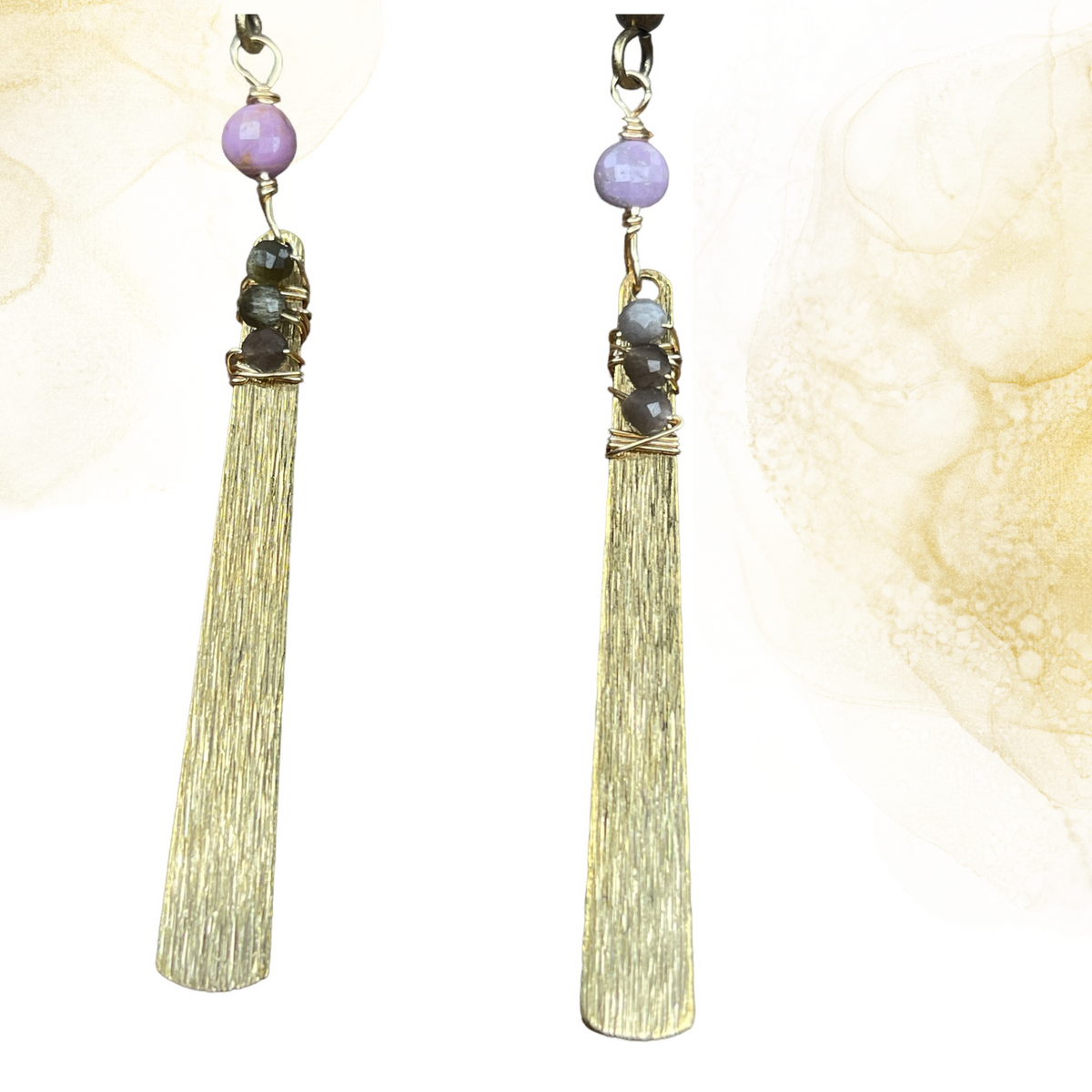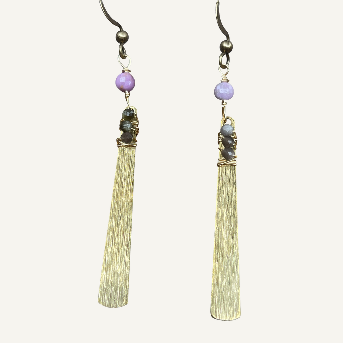 Brass fan earrings with purple mica and obsidian