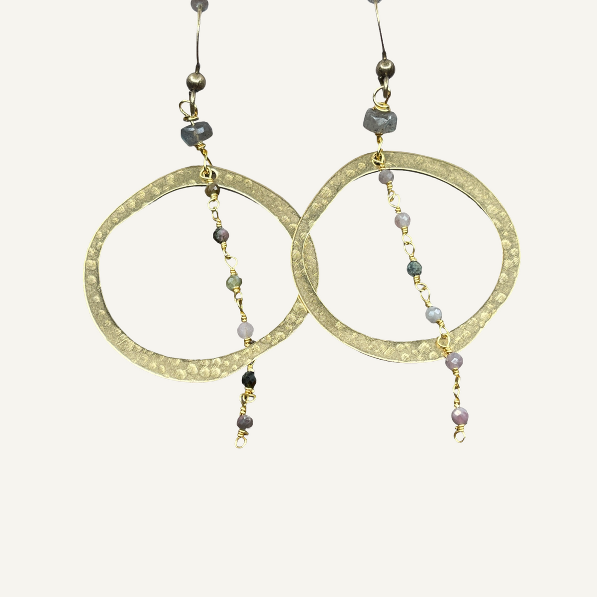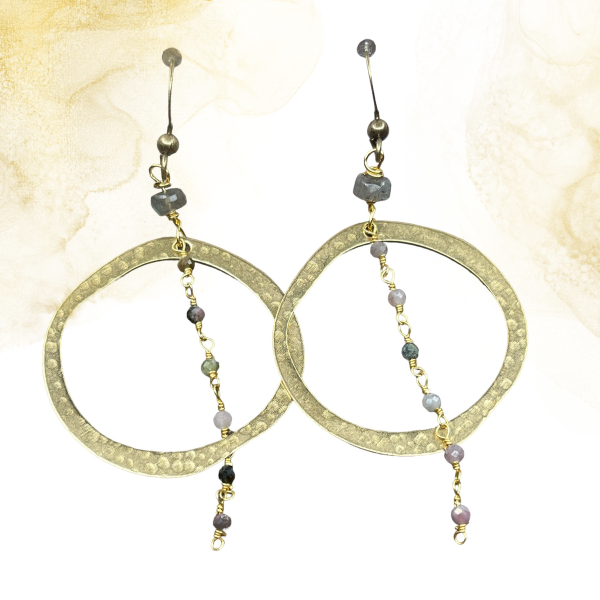 Tourmaline gracefully sways within elegantly crafted brass hoops.