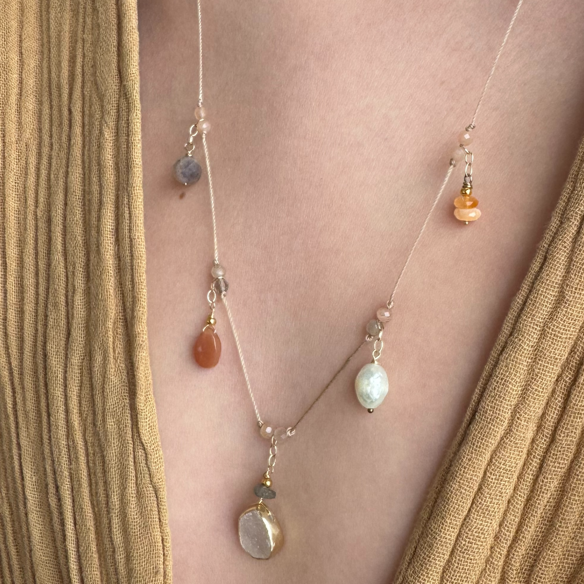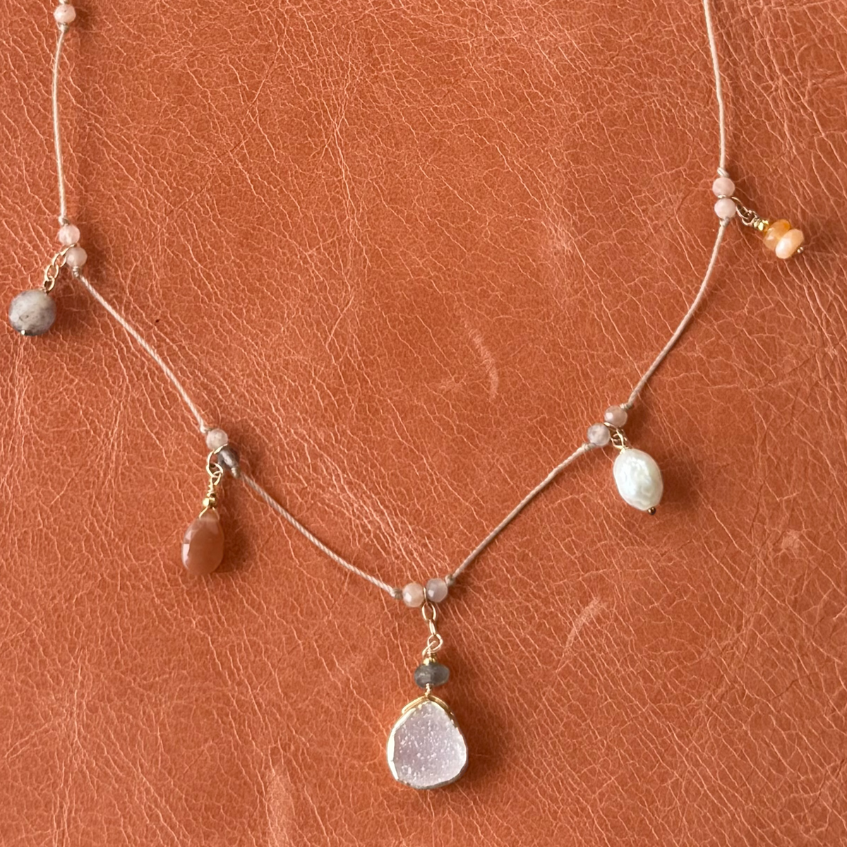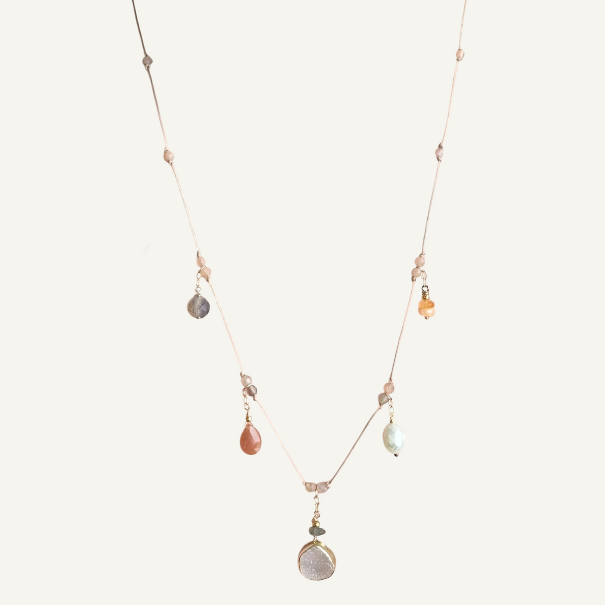 This elegant floating hand knotted charm necklace is light and airy, featuring a variety of beautiful stones such as druzy, fire opal, pearl, and aventurine, making it lovely when worn.
