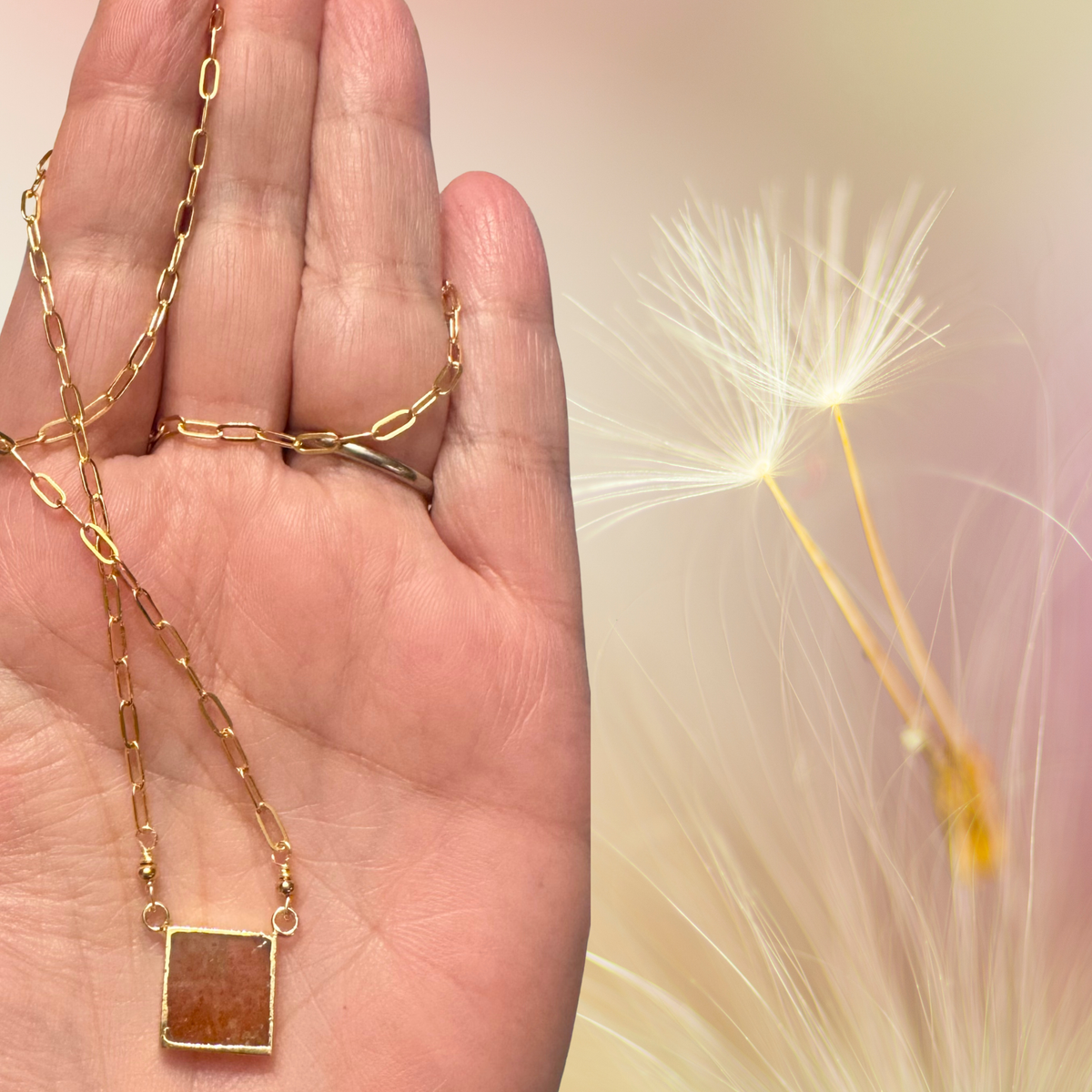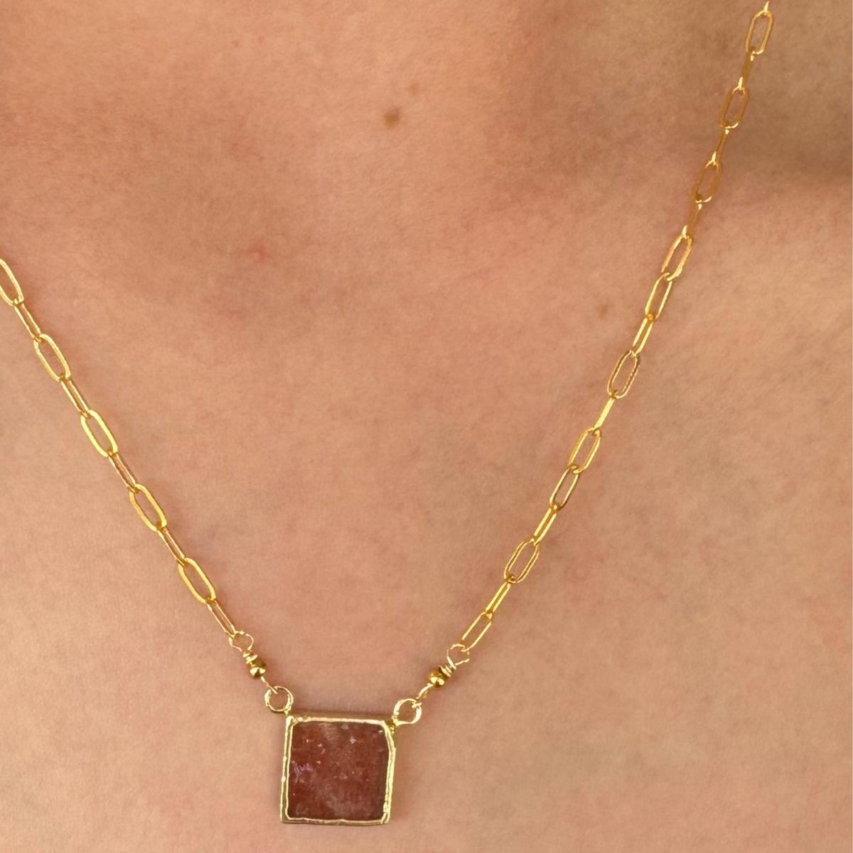 A beautiful piece, Sunstone with golden chain, shines brightly for any occasion, radiating elegance and beauty.