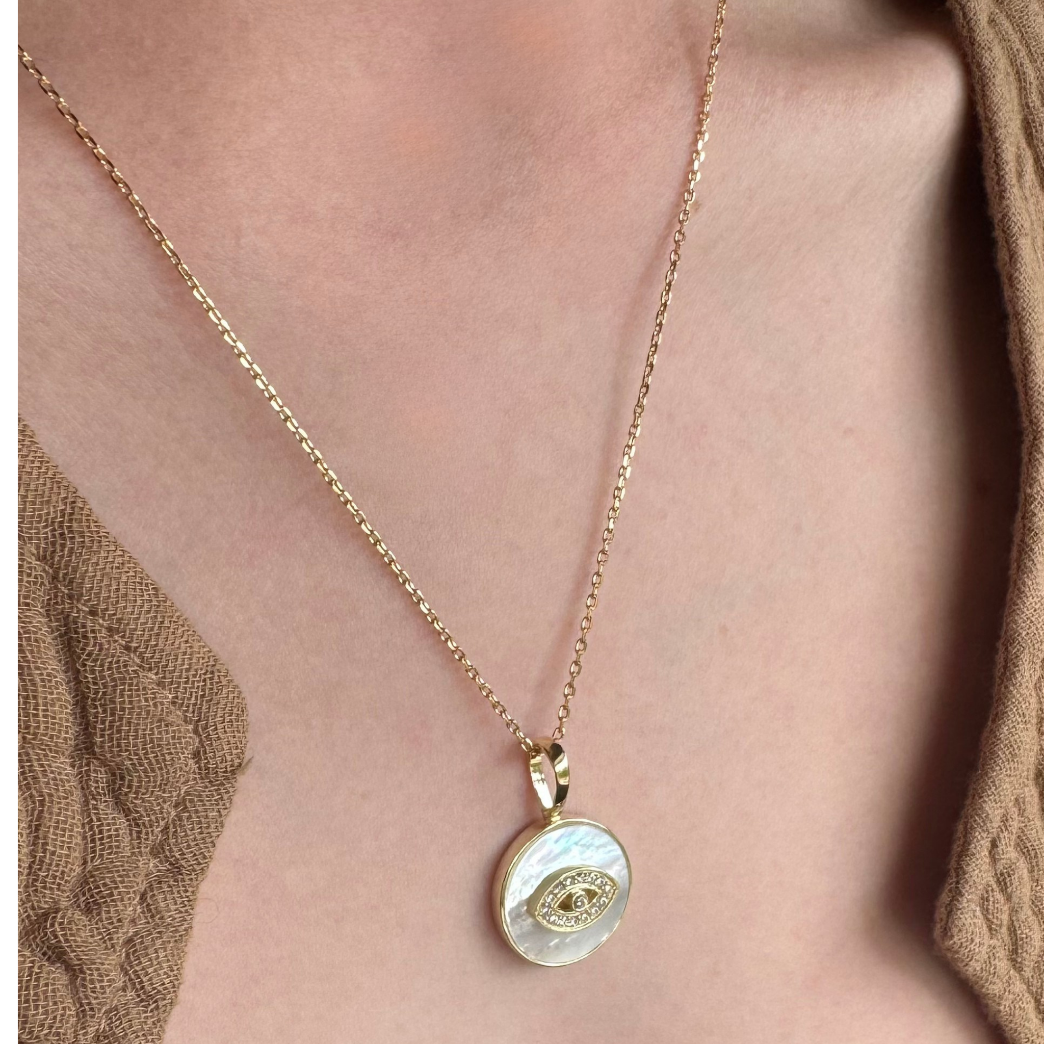 Delicate yet powerful, our Pavé Shell Evil Eye Necklace is a modern talisman designed to protect and shine. At its heart lies the ancient symbol of the evil eye—believed to ward off negative energy—elegantly inlaid on a luminous natural shell and surrounded by shimmering pavé-set crystals.