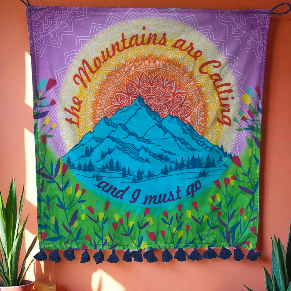 Infused with wanderlust and wild heart energy, this “The Mountains Are Calling and I Must Go” tapestry is a soulful tribute to nature lovers, explorers, and free spirits. With soft tones and a breathtaking mountain scene, it turns any room into a dreamy escape.