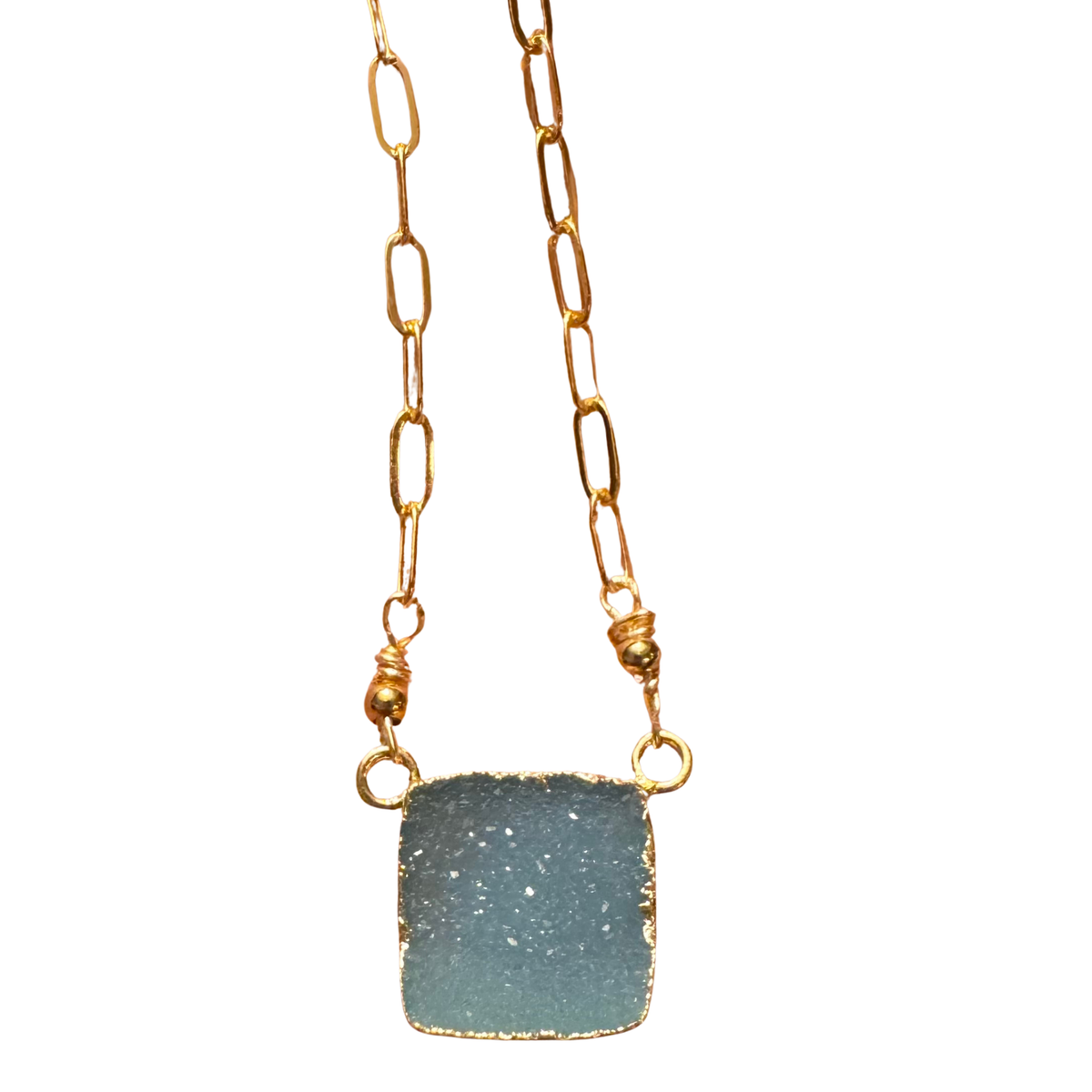 Let your inner light shimmer with our Blue Druzy Square Necklace—a little piece of magic you can wear. With its raw, glittering surface and rich ocean-blue hues, this druzy stone feels like a treasure found on a coastal road trip.