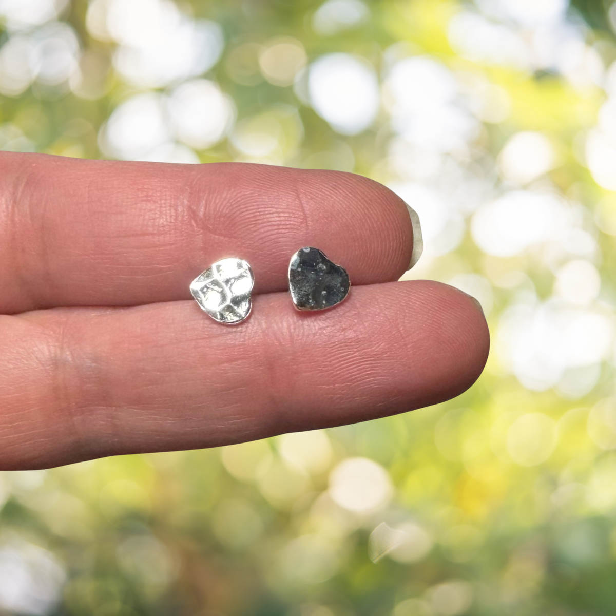 Add a touch of texture and charm with these heart stud earrings. Handcrafted from genuine 925 sterling silver, each heart features a unique hammered finish that catches the light beautifully, offering a subtle shimmer and artisanal feel. Their organic shape and elegant simplicity make them a timeless choice for everyday wear or thoughtful gifting.