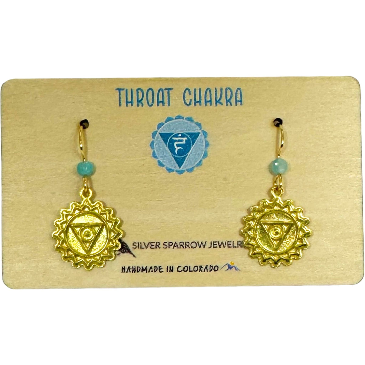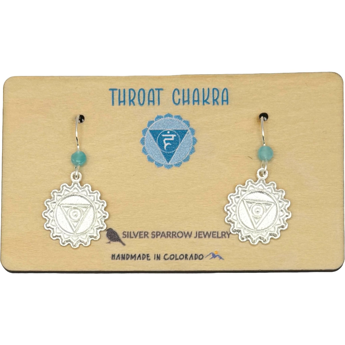 The throat chakra, also known as Vishuddha, is the fifth chakra in the body in the Hindu tradition of tantra. It's located in the center of the neck, at the level of the thyroid gland. The chakra motif is paired with amazonite.