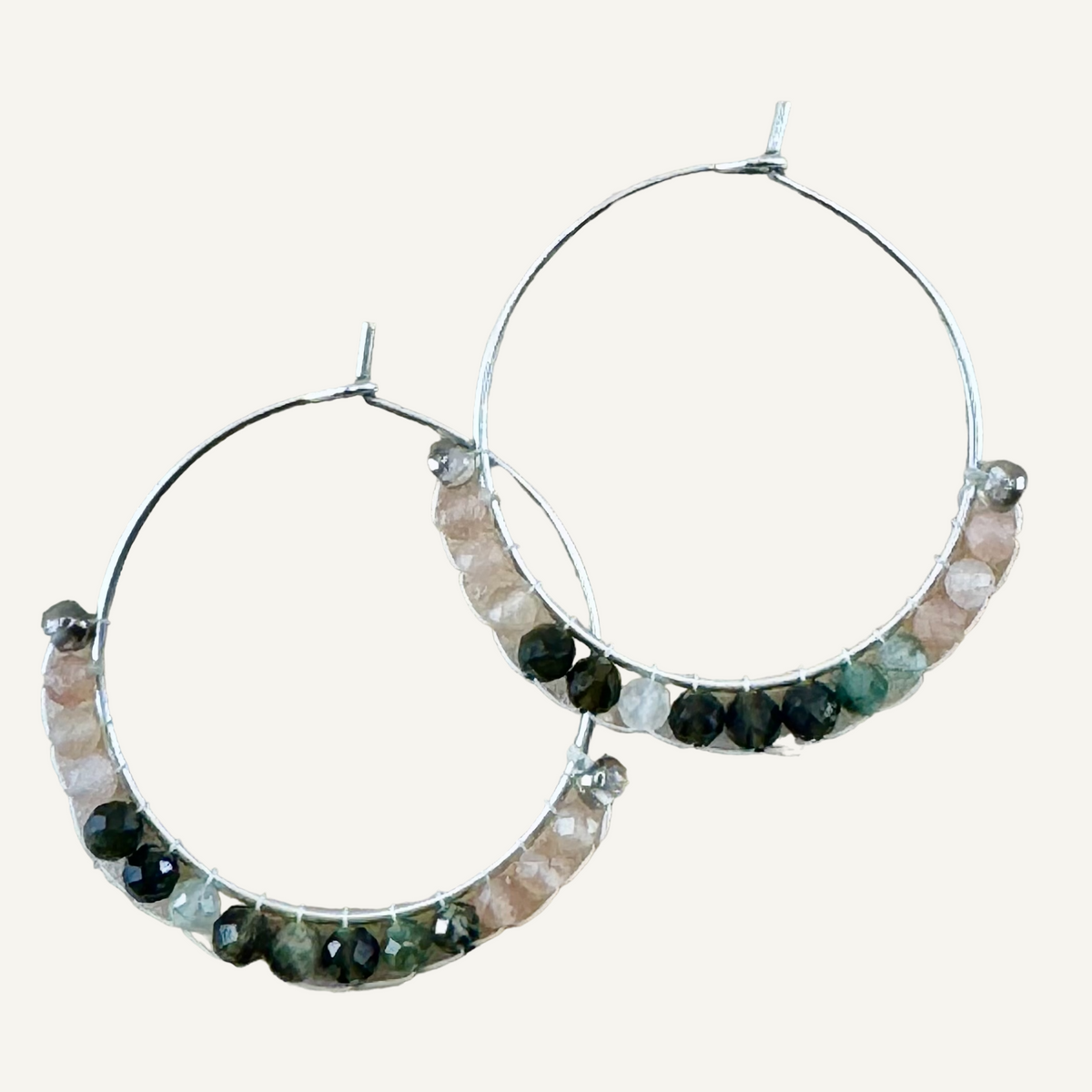 These hoops are some of our favorites, featuring color combinations of obsidian, turquoise, and sunstone. They look beautiful when worn and are handwoven in our studio.