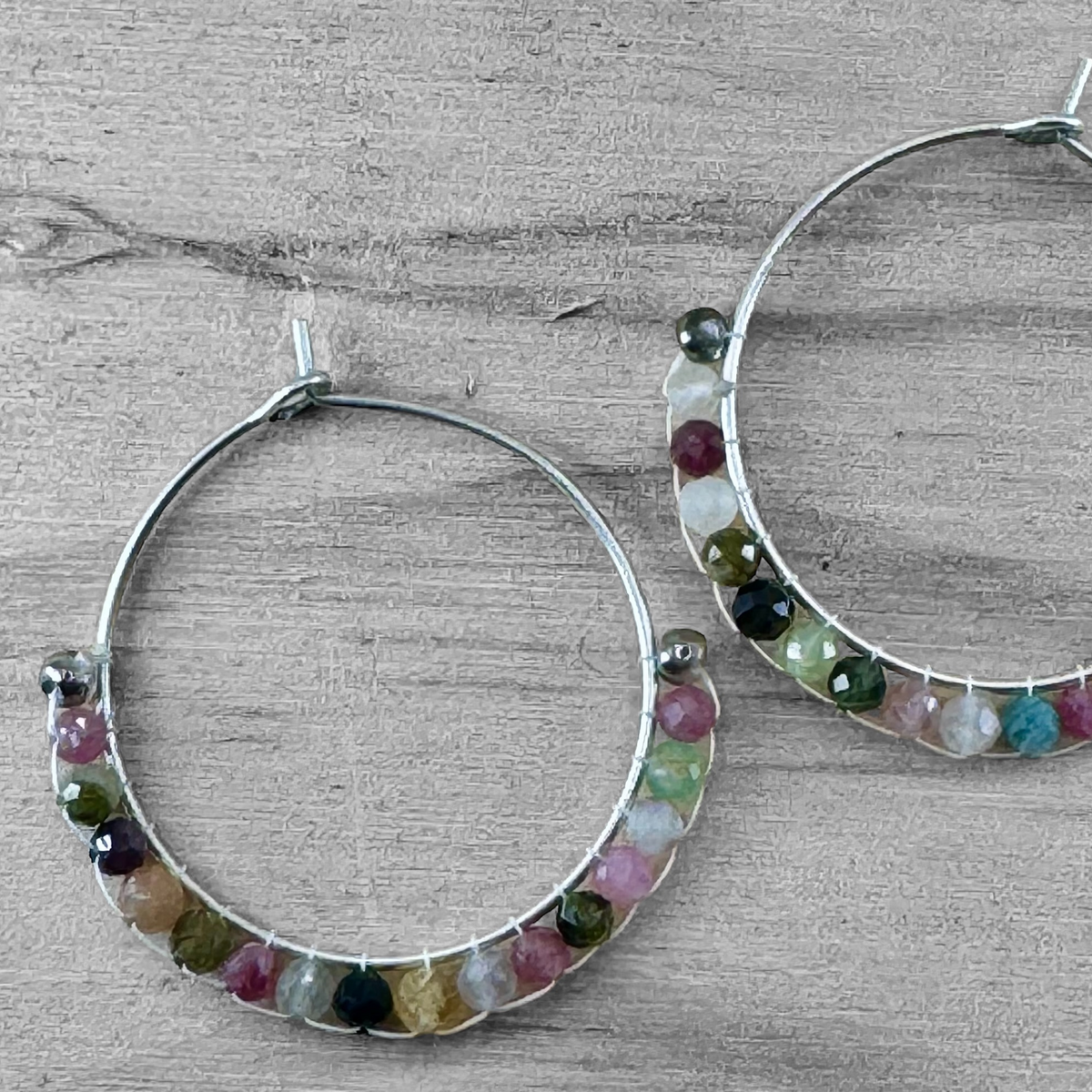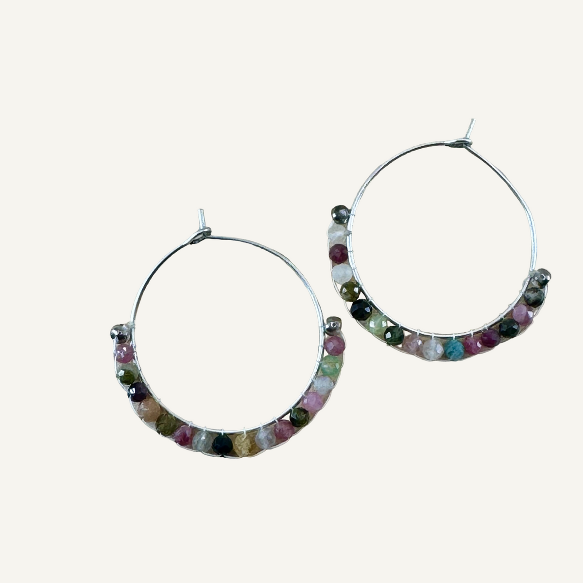 These hoops are truly special, showcasing the stunning beauty of tourmaline. When worn, they radiate brilliance and are lovingly handwoven in our studio, embodying the art of craftsmanship.
