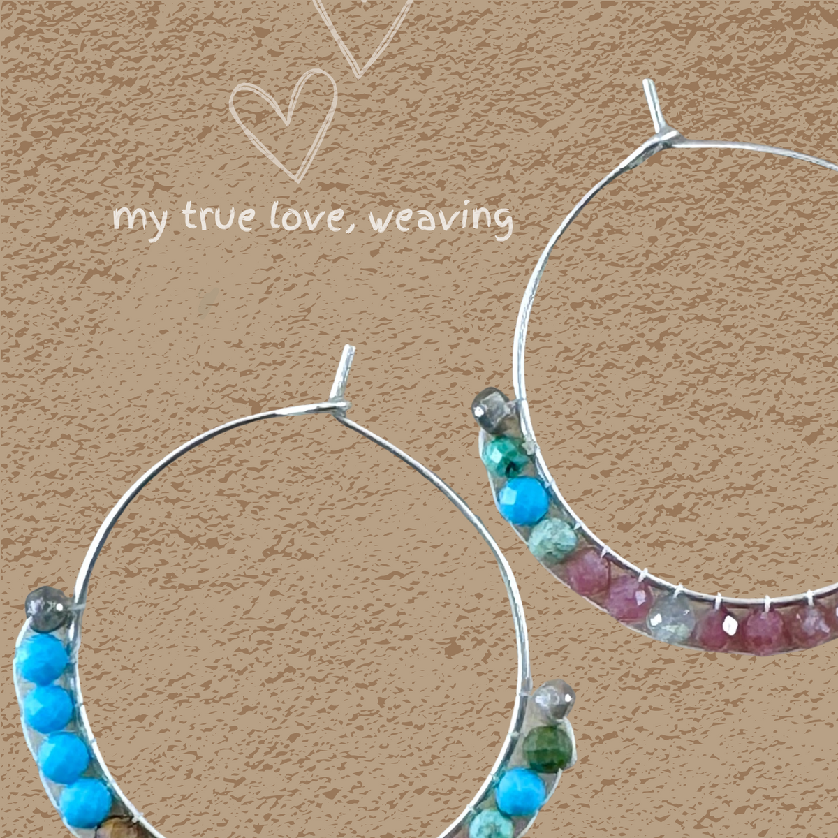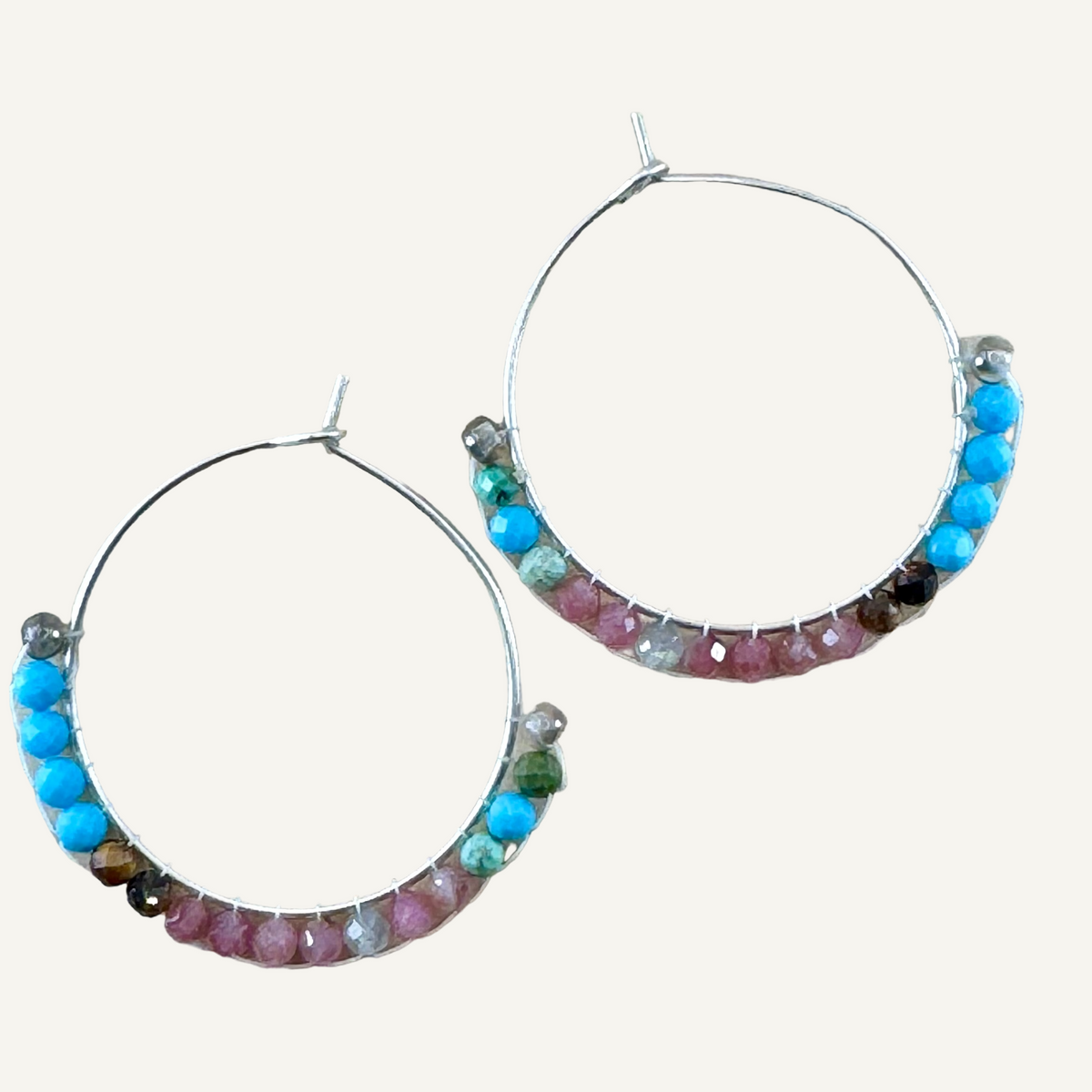 These exceptional hoops feature captivating combinations of turquoise, tourmaline, and tiger eye, radiating brilliance as they are lovingly handwoven in our studio.