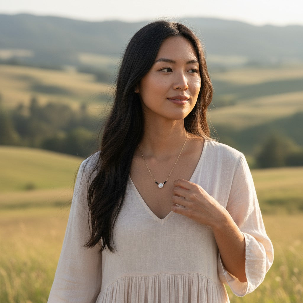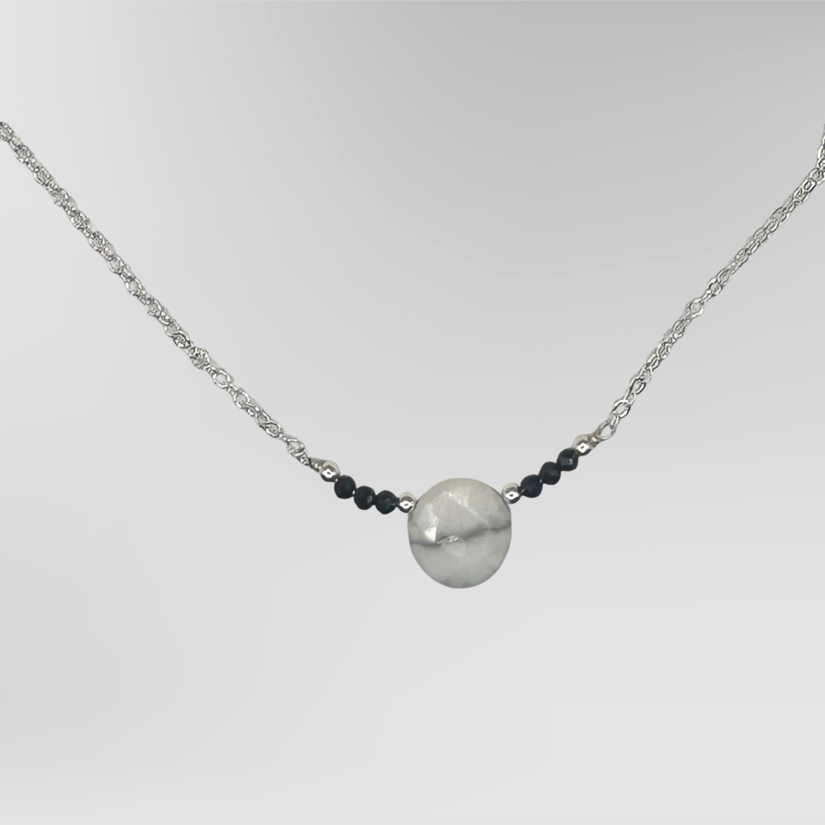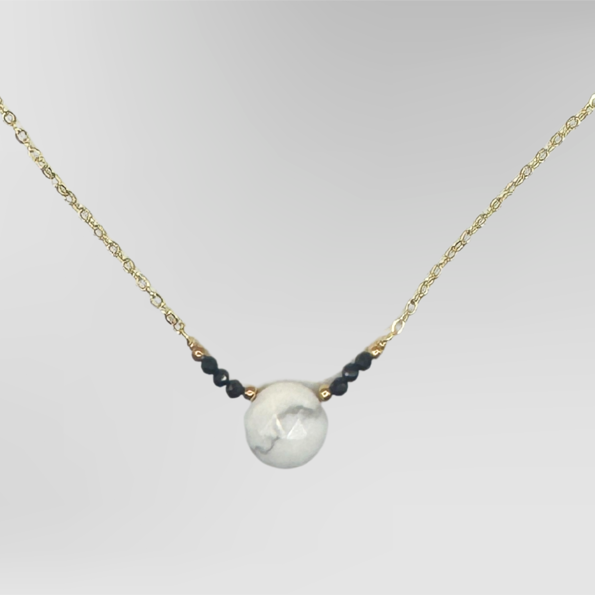 This elegant necklace features a stunning 10mm round howlite centerpiece flanked by charming faceted black spinel beads, perfect for adding a touch of magic to your everyday style!