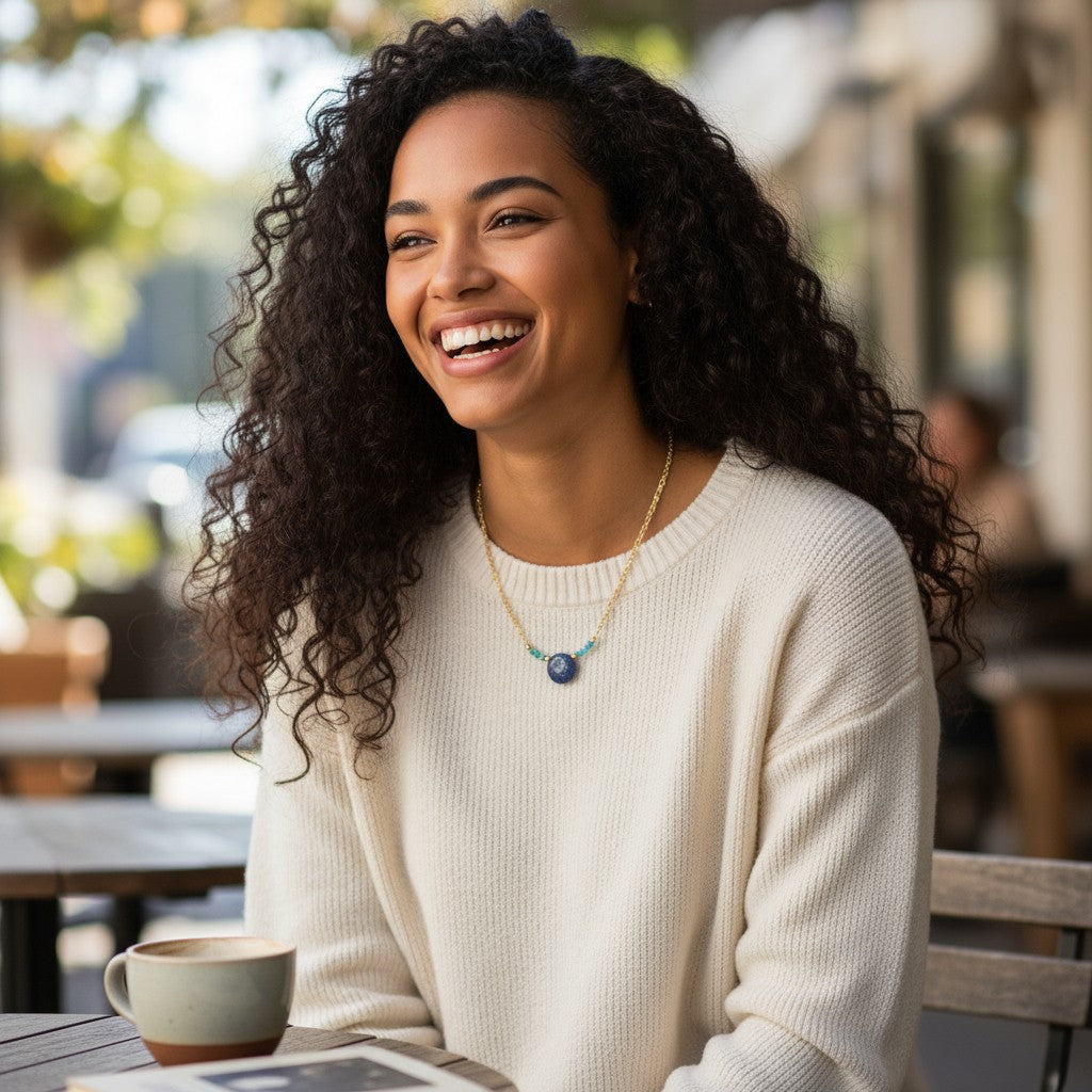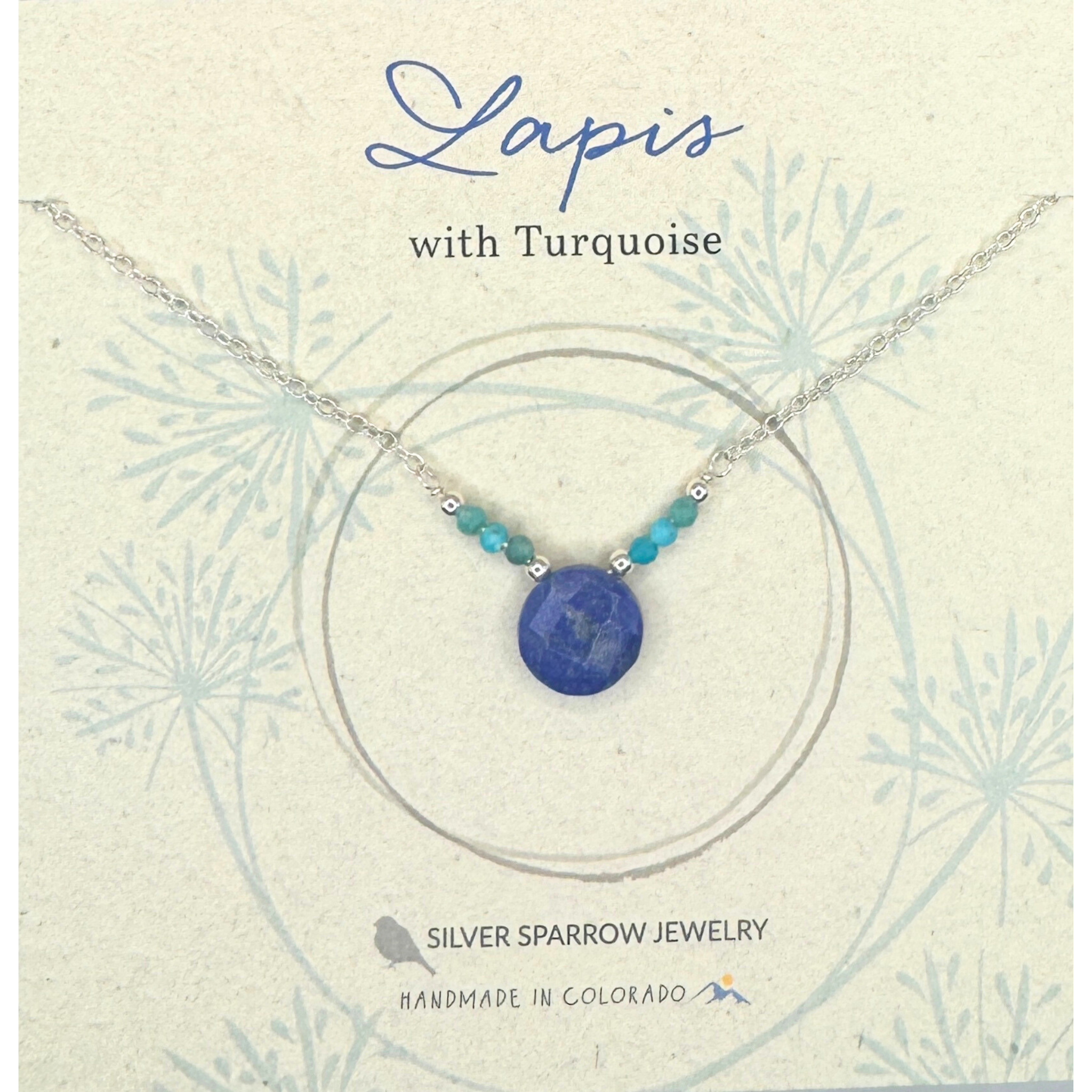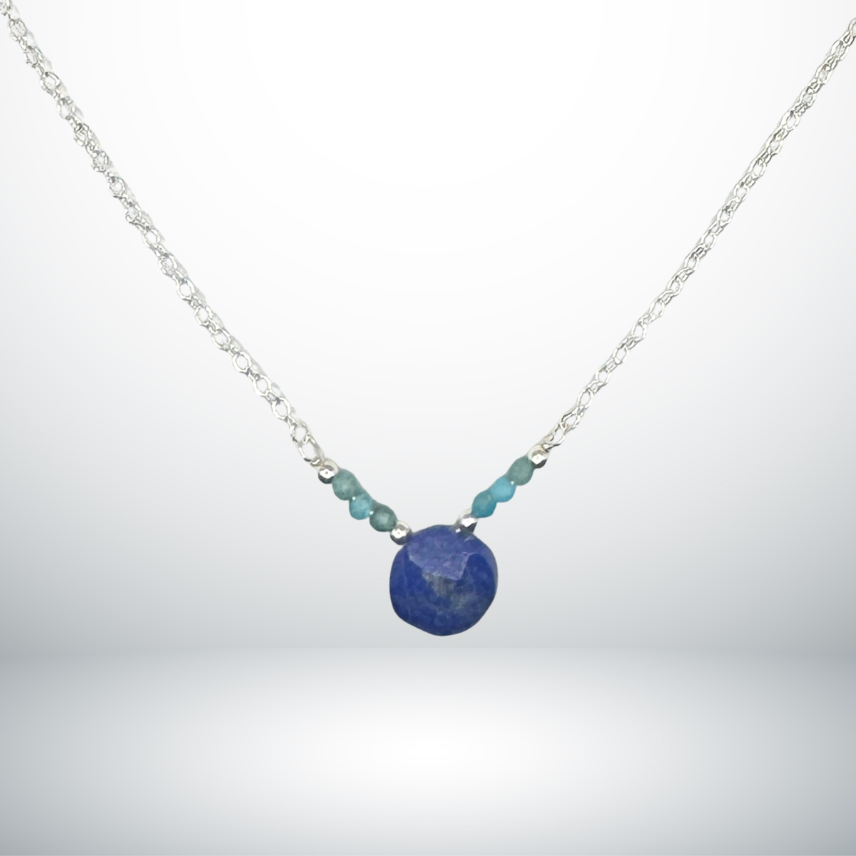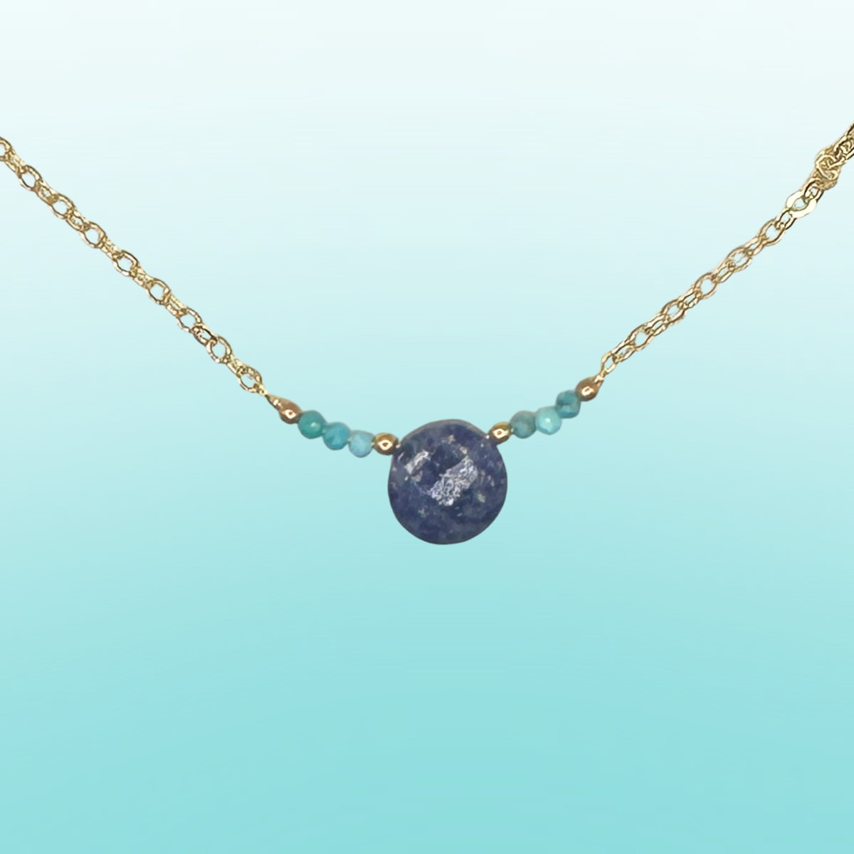 This elegant necklace features a stunning 10mm round lapis centerpiece flanked by charming faceted turquoise beads, perfect for adding a touch of magic to your everyday style!