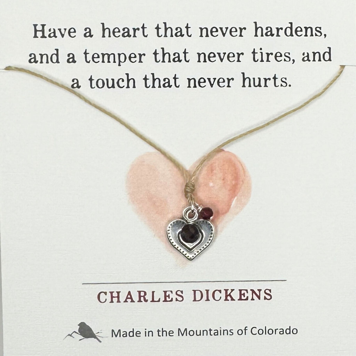 Based on a Dickens quote, this necklace features a heart charm with garnet.