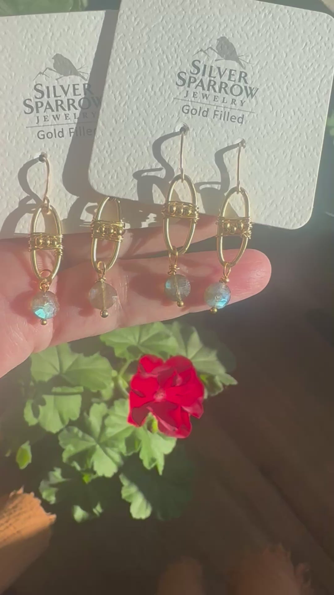 Lengthy forged ovals wrapped delicately with 14kt gold beads, accompanied with labradorite coins, finished with hand-forged earwires.