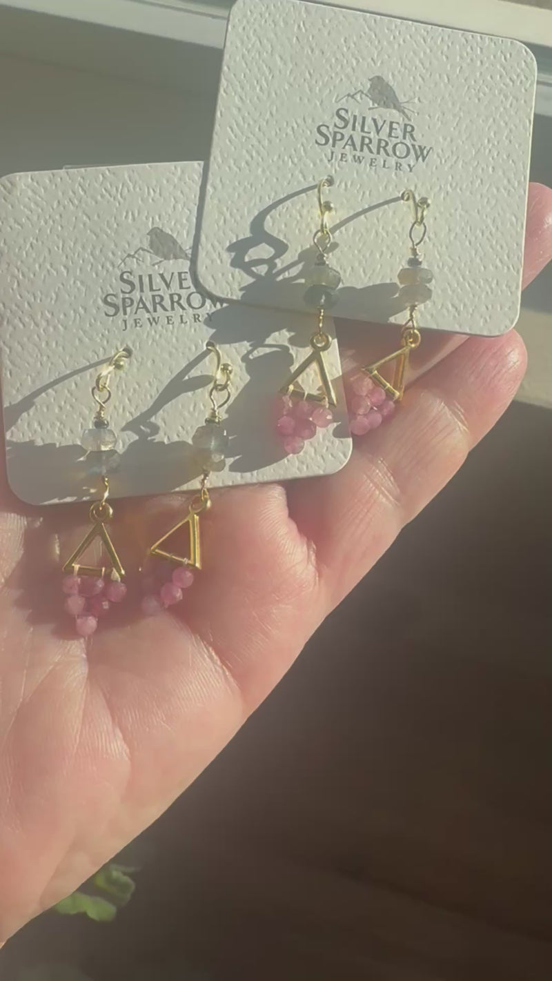 Gold triangle with pink tourmaline and labradorite earrings