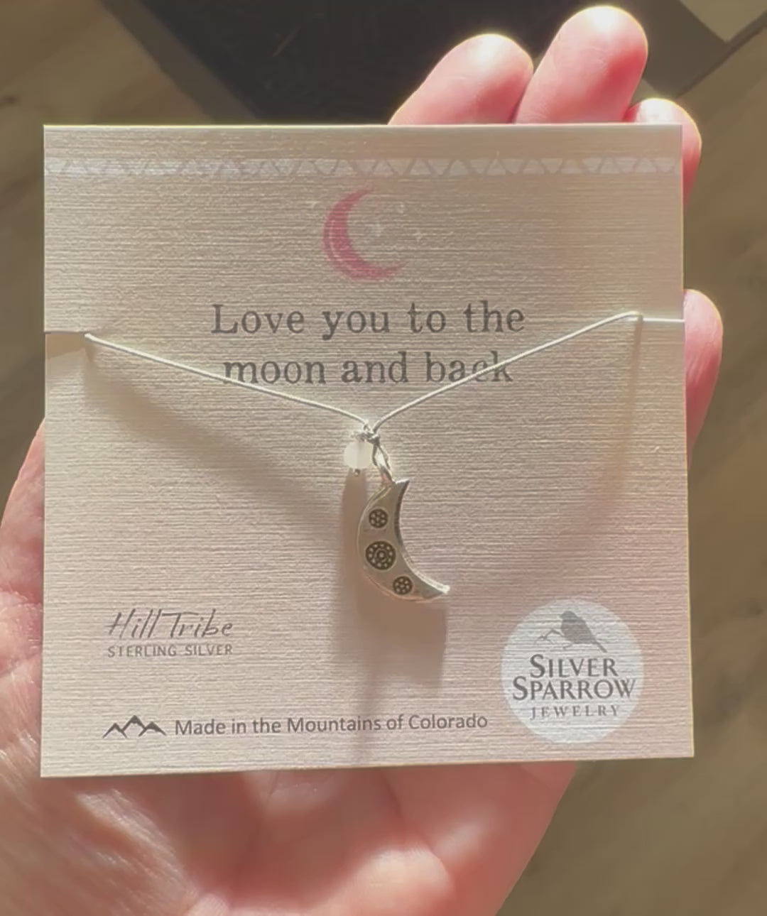 This beautifully stamped moon necklace, adorned with rose quartz, inspires love and radiates positivity.
