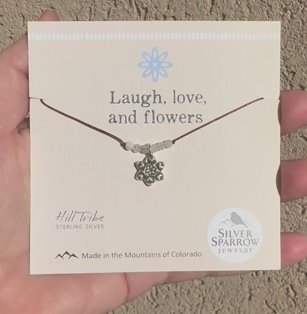 The simple joys of life shine through in flowers and nature, this sterling silver flower is beautifully embraced by moonstone beads.