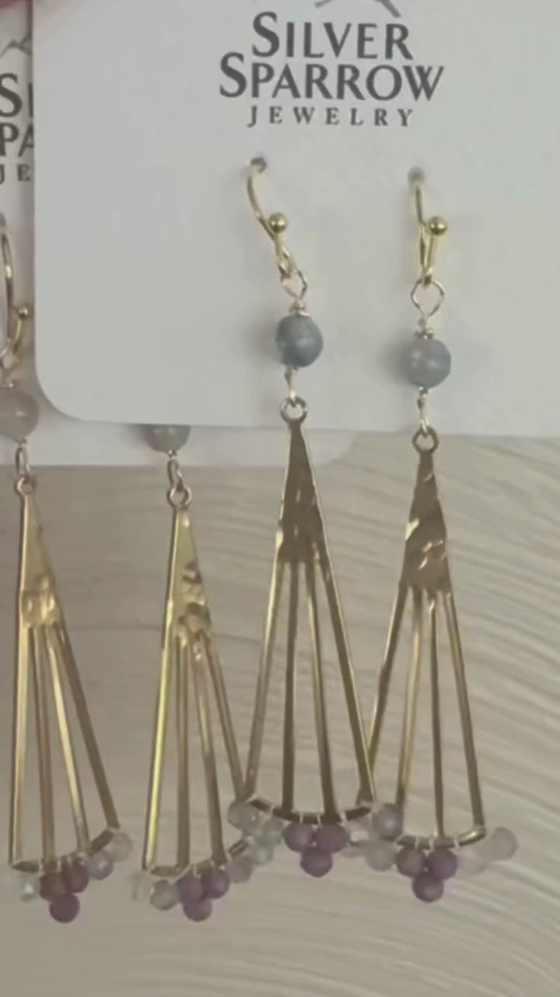 Elongated hammered fans are beautifully woven with vibrant purple mica and shimmering labradorite beads, enhanced by the serene presence of kyanite stones.